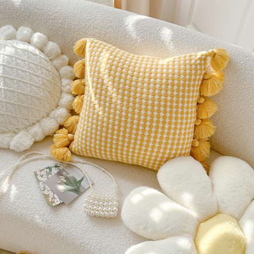 春の装いにぴったりの愛らしいタッセル付きクッションカバーです。