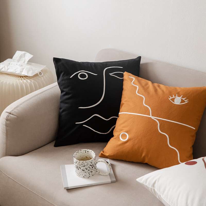 このカバーは、抽象的なデザインが特徴的な正方形の座布団カバーです。